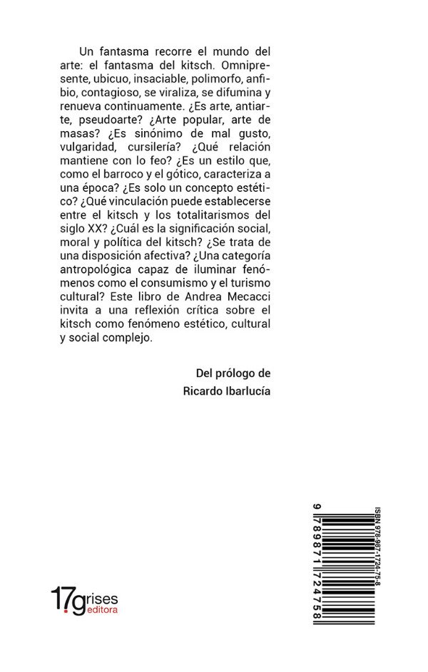 «Un fantasma recorre el mundo del arte: el fantasma del kitsch. Omnipresente, ubicuo, insaciable, polimorfo, anfibio, contagioso, se viraliza, se difumina y renueva continuamente. ¿Es arte, antiarte, pseudoarte? ¿Arte popular, arte de masas? ¿Es sinónimo de mal gusto, vulgaridad, cursilería? ¿Qué relación mantiene con lo feo? ¿Es un estilo que, como el barroco y el gótico, caracteriza a una época? ¿Es solo un concepto estético? ¿Qué vinculación puede establecerse entre el kitsch y los totalitarismos del siglo XX? ¿Cuál es la significación social, moral y política del kitsch? ¿Se trata de una disposición afectiva? ¿Una categoría antropológica capaz de iluminar fenómenos como el consumismo y el turismo cultural? Este libro de Andrea Mecacci invita a una reflexión crítica sobre el kitsch como fenómeno estético, cultural y social complejo.».
