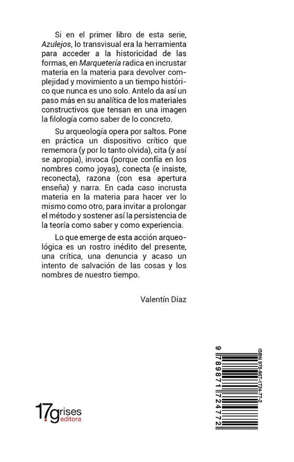 «Si en el primer libro de esta serie, Azulejos, lo transvisual era la herramienta para acceder a la historicidad de las formas, en Marquetería radica en incrustar materia en la materia para devolver complejidad y movimiento a un tiempo histórico que nunca es uno solo. Antelo da así un paso más en su analítica de los materiales constructivos que tensan en una imagen la filología como saber de lo concreto.